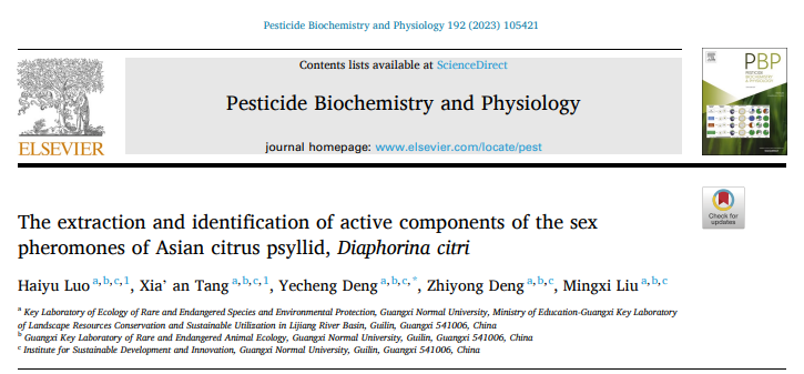 2023年4月,生命科学学院邓业成教授、骆海玉副教授课题组在国际学术期刊《Pesticide Biochemistry and Physiology》(中科院一区TOP期刊)发表题为“The extraction and identification of active components of the sex pheromones of Asian citrus psyllid, Diaphorina citri”的最新研究成果,论文对柑橘木虱的性信息素成分进行了深入研究。