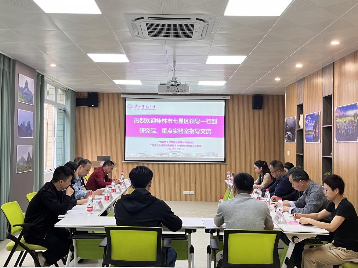 4月14日上午,桂林市七星区人大常委会副主任张永红一行到广西师范大学可持续发展创新研究院(以下简称“研究院”)、广西漓江流域景观资源保育与可持续利用重点实验室(以下简称“重点实验室”)调研交流,七星区农业综合技术推广站站长陈宏彬、桂林市莲花源生态农业旅游发展有限公司董事长仇秀武及相关负责人随行到访,研究院和重点实验室从事生态农业、生态旅游、生态规划、产业经济、可持续发展等研究方向的相关教师参加了座谈会。