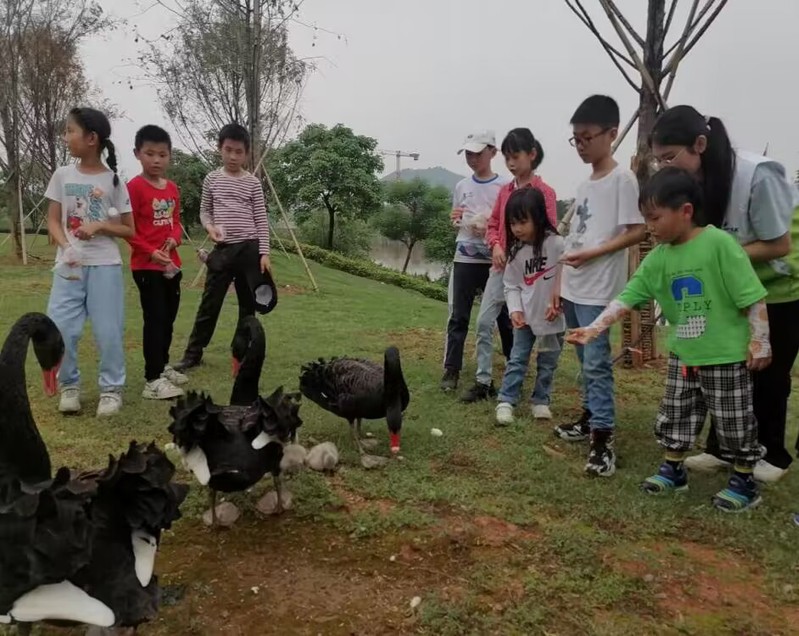 下午场活动伊始,研学志愿者带领小朋友寻找校园萌宠——黑天鹅进行投喂,小朋友在“寻萌宠之旅”笑逐颜开,旅途妙趣横生。接着开展“探索水中的微观世界”科普小课堂,通过课堂,小朋友知道了生态系统的组成成分。最后,研学团队的志愿者带领小朋友制作精美的“小鱼生态瓶”,并合影留影,为这场趣味横生的研学之旅画上圆满的句号。