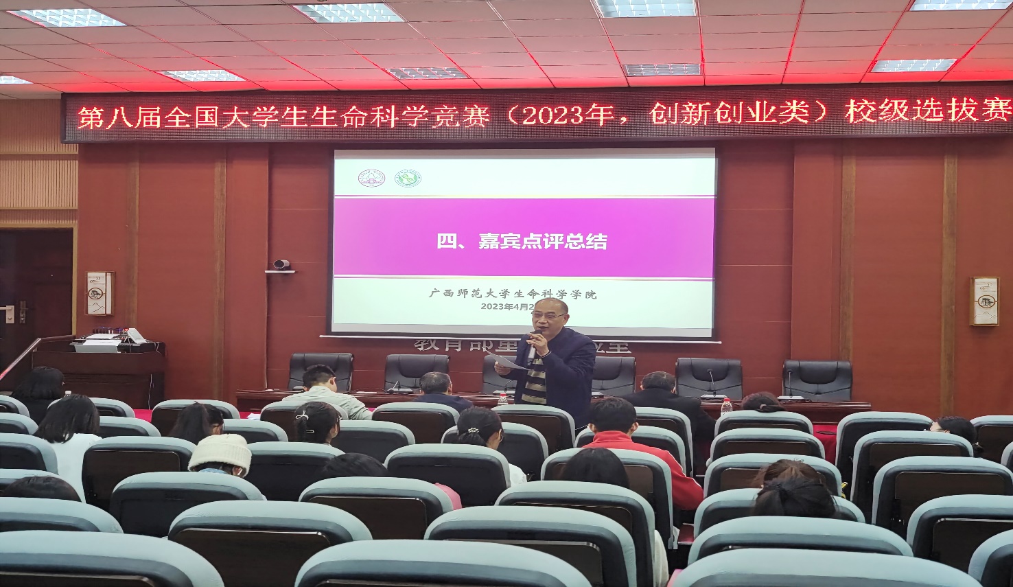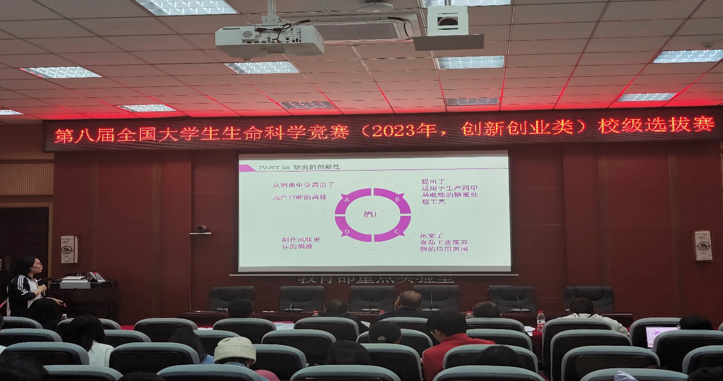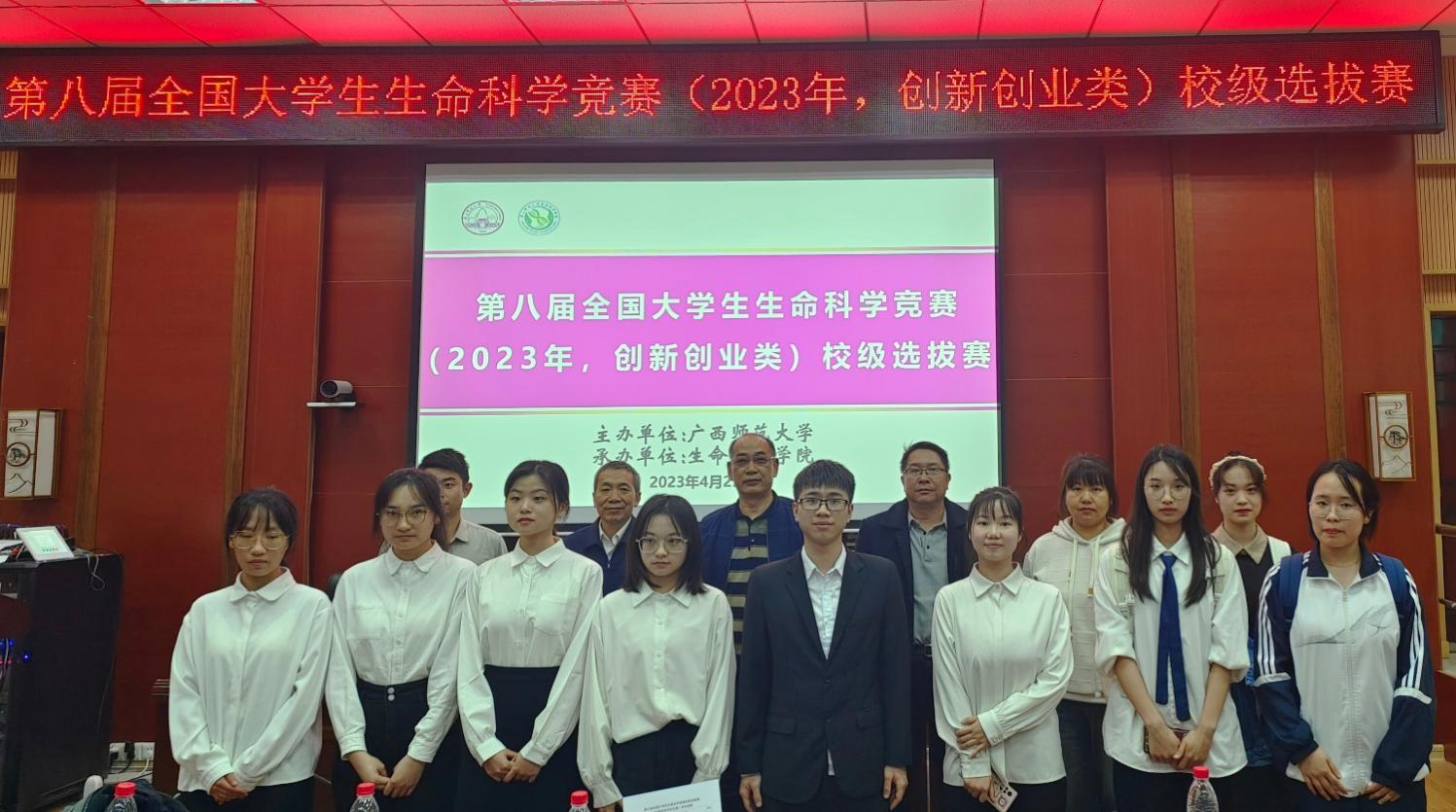 为进一步培养大学生的创新创业思维、创新精神与开拓进取精神,提高大学生的创新创业能力,提高我校参赛项目质量、提升我校赛事成绩,2023年4月25日下午,第八届全国大学生生命科学竞赛(2023年,创新创业类)广西师范大学校级选拔赛于雁山校区伯康楼112报告厅顺利举行。本次比赛由广西师范大学主办、生命科学学院承办,来自生命科学学院、环境与资源学院、化学与药学学院3个学院的12个团队以“线上+线下”方式参加比赛。比赛采用团队赛形式,每个团队由1-2名指导老师和不超过6名全日制在校本科生组成,以“线上+线下”的答辩方式对参赛作品的研究背景、主要内容、研究成果以及未来规划等方面进行展示,由五位评委老师进行现场点评。