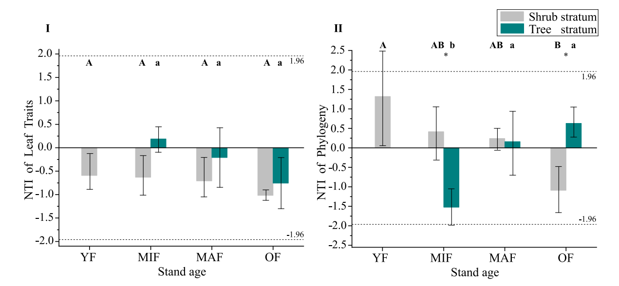 图3 马尾松人工林近自然恢复过程中叶片性状与系统发育种间亲缘关系指数变化