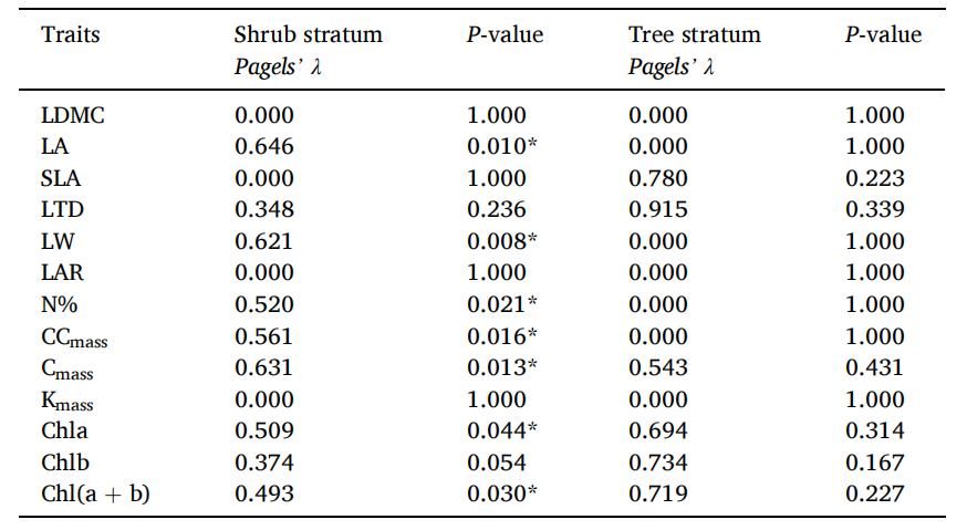 表1 马尾松人工林群落不同层次植物系统发育信号