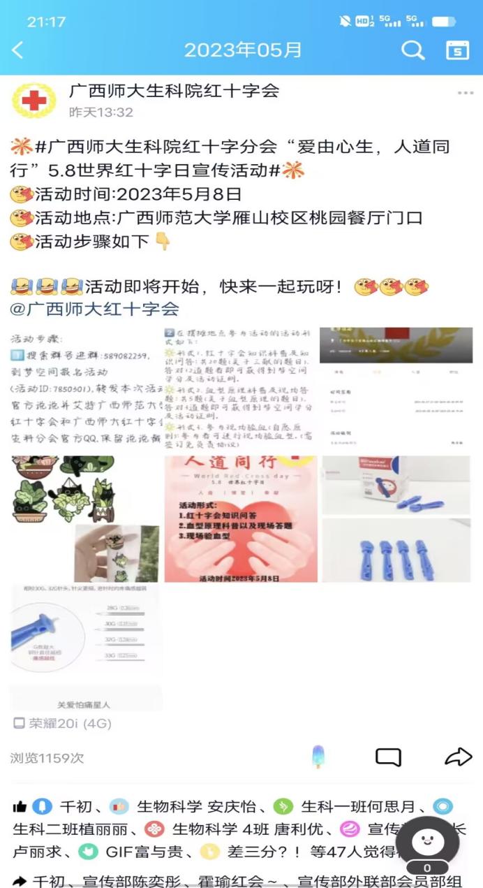 为了纪念世界红十字日,大力弘扬“人道、博爱、奉献”精神,5月8日生命科学学院红十字会分会于桃园广场开展“弘扬愿精神,凝聚人道力量”红十字会日活动。