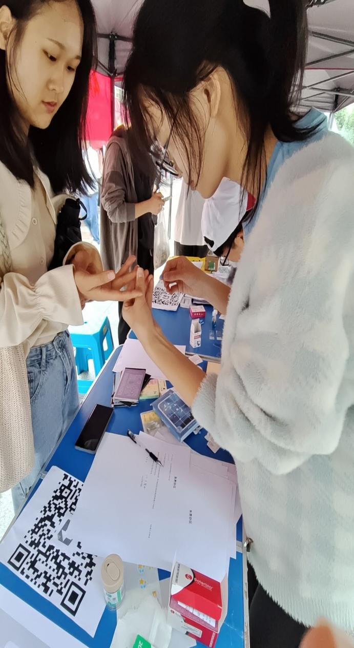 此次活动以科普“三献”知识为主,同时让同学们通过参与红十字会知识问答、血型原理科普以及现场答题现场验血型来加深对“三献”知识的了解,并为参加活动的同学发放小奖品。活动摊位充满了工作人员解惑的声音和同学们的欢声笑语。