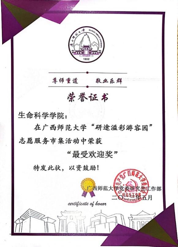 近日,广西师范大学研究生会公布了“研途溢彩游容园”志愿服务市集活动评选结果,我院“定格春天,传递温暖”手作滴胶义卖活动荣获“最受欢迎奖”。