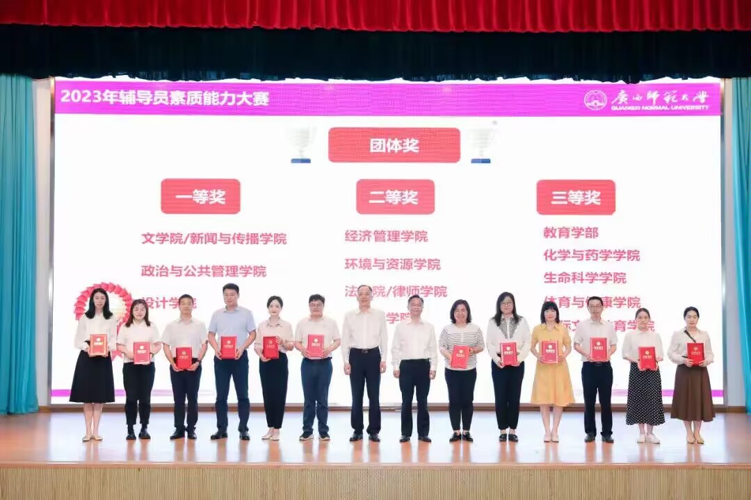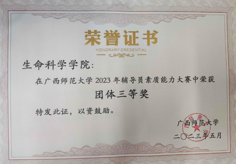 为加强辅导员队伍职业化、专业化建设。近期,我校举办广西师范大学2023年辅导员素质能力大赛。在本次比赛中,生命科学学院获辅导员素质能力大赛“团体三等奖”,我院卢洁老师获“优秀思政工作案例奖”和“理论达人奖”,黄倩老师和徐夏帆老师获辅导员素质能力大赛“优秀奖”。