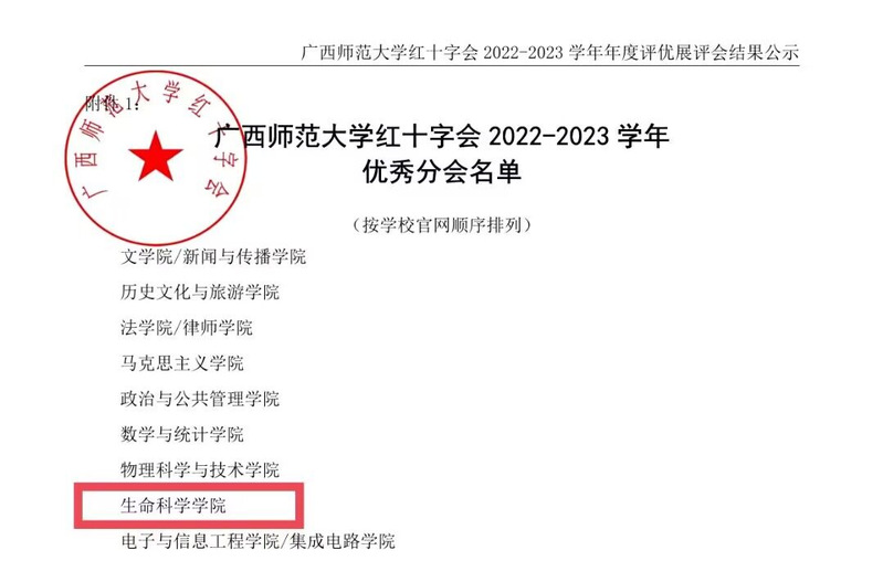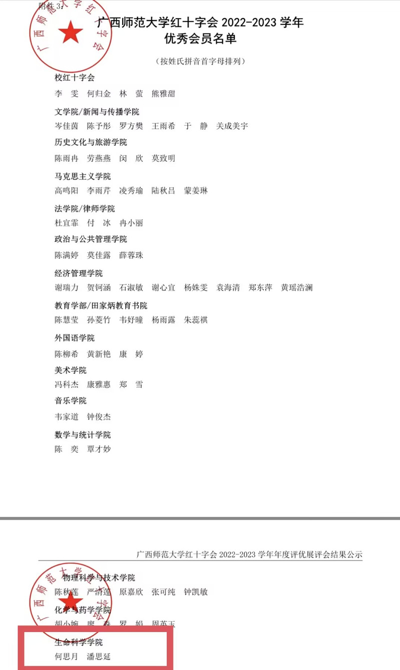 生命科学学院红十字分会被评为广西师范大学红十字会2022-2023学年优秀分会;何思月、潘思延两位同学被评为广西师范大学红十字会2022-2023学年优秀会员。