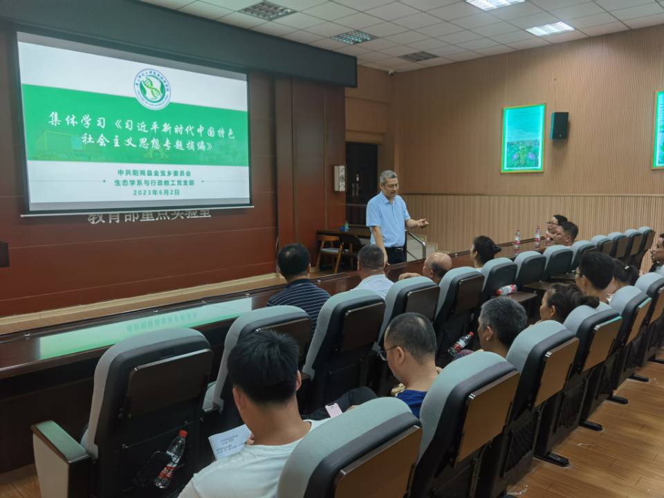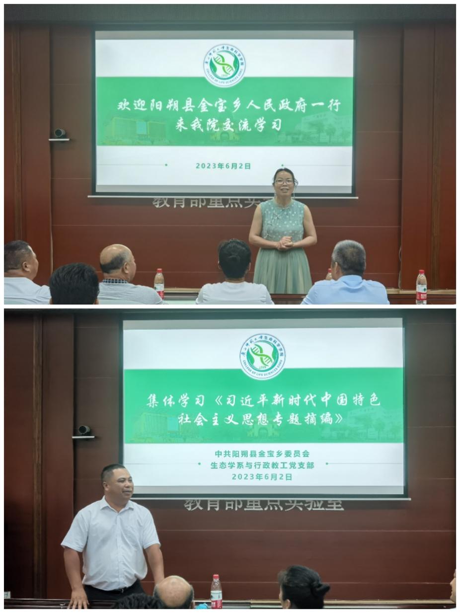 活动伊始,金宝乡党委书记倪发军同志结合《习近平新时代中国特色社会主义思想专题摘编》内容,向大家分享了学习心得和体会。接着,生态学系及行政教工党支部书记刘可慧、红莲村党总书记谢新有和生物学系教工党支部党员分别谈了学习体会。会上,双方还就党建发展、乡村振兴、科技助农等方面开展交流。会后,阳朔县金宝乡一行人员在刘可慧书记陪同下,还参观了广西师范大学生物多样性博物馆。