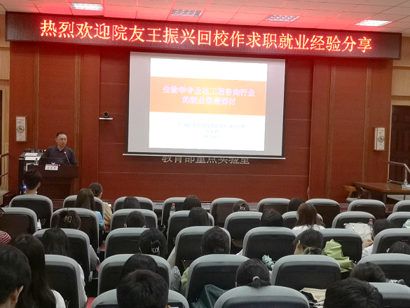 为让同学们更充分了解当前的就业形势,进一步明确未来职业规划方向,增强就业能力和核心竞争力,2023年6月7日下午,由学校党委研究生工作部主办,生命科学学院承办的第十六期“广西师范大学2023年春季学期研究生求职就业经验讲坛”在雁山校区伯康楼112学术报告厅举行。本次讲座特邀我院2010届生态学研究生、广西渌金生态科技有限公司总经理王振兴主讲,讲座由研究生专职辅导员黄倩老师主持,生命科学学院在读研究生共计150余人参加。