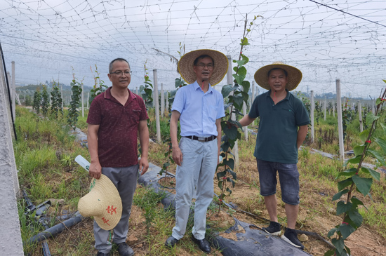 广西师范大学生命科学学院硕士生导师李伯林(中)副教授为永福罗汉果种植户提供技术支撑。