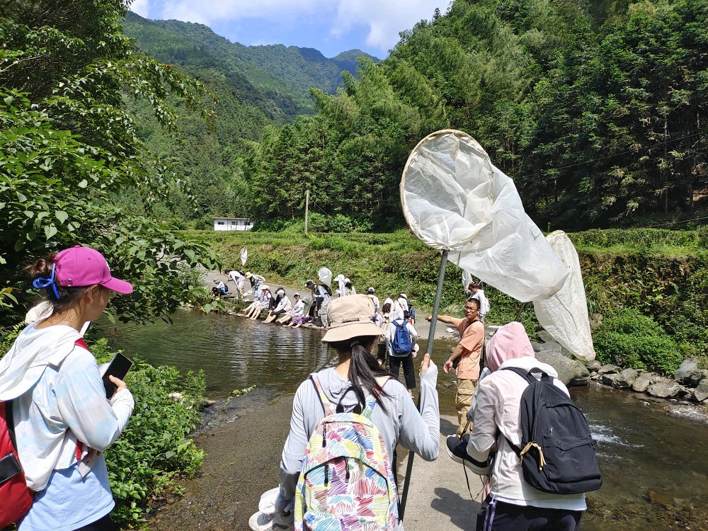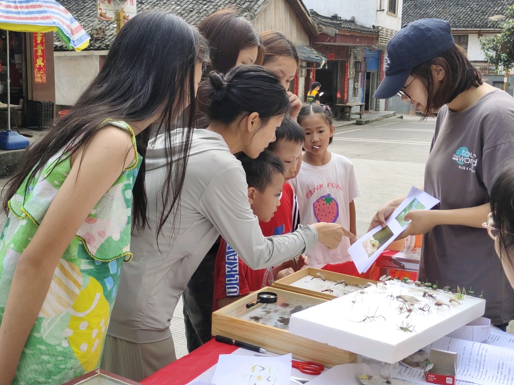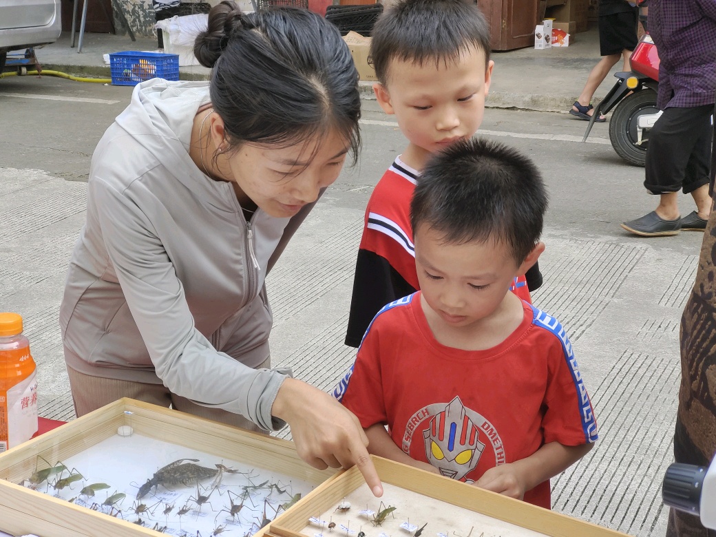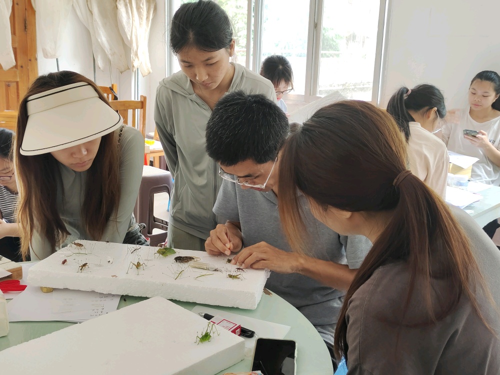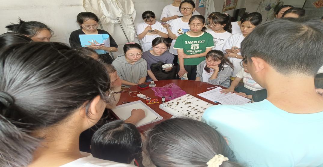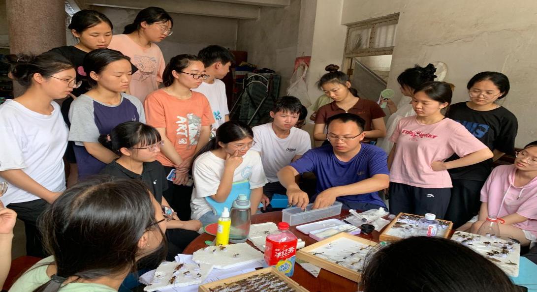 读万卷书,行万里路,踏遍青山绿水。本次动物野外实习以小组为单位开展教学实践活动,各小组分别前往兴安县溶江乡、花坪县、宛田瑶族乡、黄沙瑶族乡和灵川海洋乡等地开展野外实习,对野外动物的分布、生活习性等进行观察和研究,通过采集昆虫动物标本,进行测量、初步鉴定及分类,从而完成相应课程考核内容。实习过程中,学院专业老师为同学们提供专业指导,实习队伍穿行在野外的青山绿水间,师生共同在丛林间探寻昆虫,在树木下观察飞鸟,寻找各种动物,观察它们的形态特征。部分小组还前往海洋山小平乐小学、黄沙瑶族乡街道现场开展主题科普活动,通过标本展示、知识宣讲等介绍方式,引导大家崇尚科学,尊重自然,树立保护生态环境的良好观念。黄沙小组袁欣彤同学分享道:“野外实习为我们提供了一个认识自然界动物和生态环境的机会,通过本次野外实习加深了我们对科学严谨的态度,并锻炼了自己细心观察和动手的能力。”