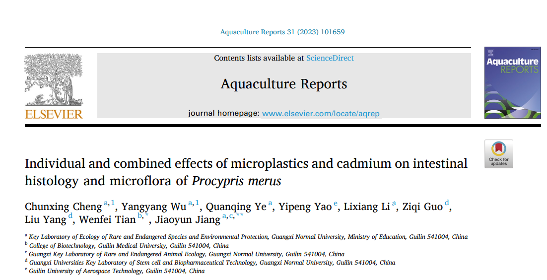 2023年7月10日,相关研究结果在国际学术期刊《Aquaculture Report》(中科院二区, IF=3.7, JCR Q1区)上以题为“Individual and combined effects of microplastics and cadmium on intestinal histology and microflora of Procypris merus”发表。论文第一单位为广西师范大学珍稀濒危动植物生态与环境保护教育部重点实验室,2021级硕士研究生程春醒为第一作者,2021级硕士研究生吴扬扬为共同第一作者,蒋骄云博士为通讯作者。
