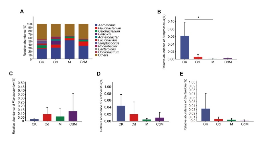 在门水平上,变形菌门(Proteobacteria)在所有肠道样本中丰度最高,其它优势菌门依次为拟杆菌门(Bacteroidetes)、厚壁菌门(Firmicutes)。相比于对照组,厚壁菌门丰度,厚壁菌门/拟杆菌门比值(肠道稳态、营养物质吸收的重要评价指标之一)在各处理组中均下降,而在M组中差异显著(图3)。在属水平上,优势菌属分别是气单胞菌属(Aeromonas),黄杆菌属(Flavobacterium),鲸杆菌属(Cetobacterium)等,其中与炎症相关的链球菌属(Streptococcus)丰度在M组中显著降低(图4)。MPs对禾花鲤肠道微生物多样性的影响要显著高于Cd单独胁迫和Cd + MPs复合胁迫。