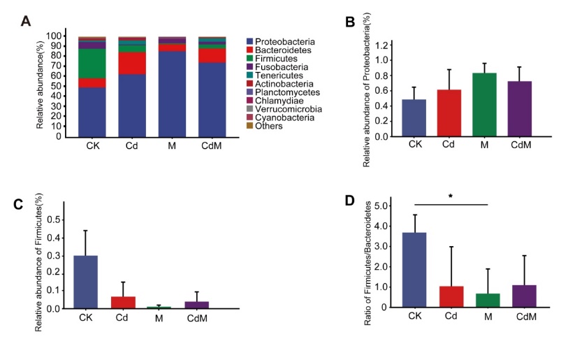 图3. 门水平上的肠道菌群组成。(A)各处理组的肠道菌群组成图;(B)Proteobacteria 相对丰度;(C) Firmicutes 相对丰度;(D) Firmicutes/Bacteroidetes 比值 。星号 "*"表示p < 0.05。