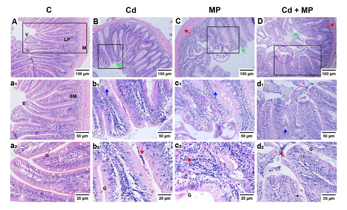 图1. 不同处理组的禾花鲤肠道组织切片图(HE染色)。(A)对照组;(B)Cd组;(C)M组;(D)CdM组。(a-d)代表A-D中相应视图的放大; M:肌肉层; LP:固有层; G:杯状细胞; V:肠道绒毛; SM:粘膜下层; E:上皮层; 蓝色箭头:空泡化; 红色箭头:炎症细胞浸润; 绿色箭头:融合; 紫色圆圈:肠绒毛脱落。