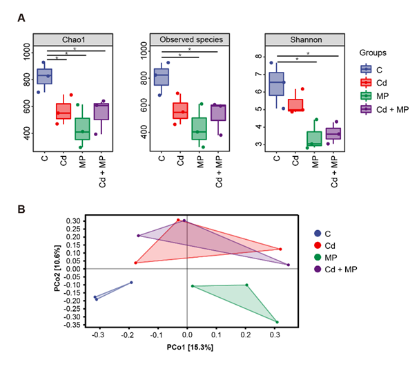 相较于对照组,各胁迫组肠道菌群的α多样性(Chao 1, observed species和 Shannon )均降低;PCoA 分析显示,Cd组和CdM组微生物组成相似度更高,而M组则明显与之分离(图2)。