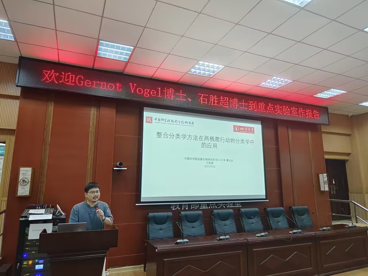 2023年9月25日上午,中国科学院成都生物研究所石胜超博士应邀到我院珍稀濒危动植物生态与环境保护教育部重点实验室(以下简称“重点实验室”)作题为“整合分类学方法在两栖爬行动物分类学中的应用”的学术报告。报告会由生命科学学院陈泽柠博士主持,学院100余名师生共同参加了本次学术报告。