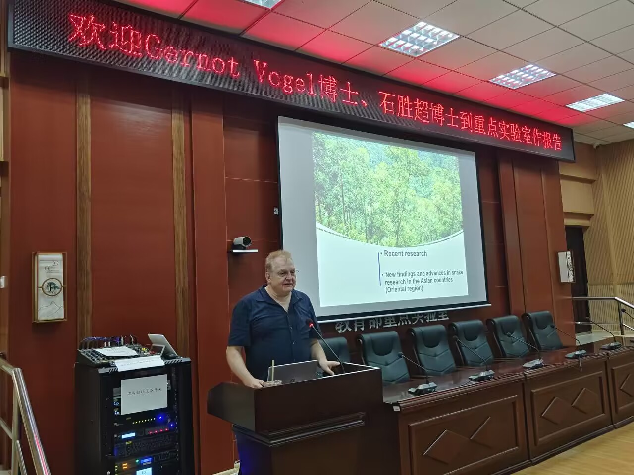2023年9月25日上午,东南亚两栖爬行动物研究所Gernot Vogel博士应邀到我院珍稀濒危动植物生态与环境保护教育部重点实验室作学术报告。报告会由学院陈泽柠博士主持,学院100余名师生参与交流研讨。
