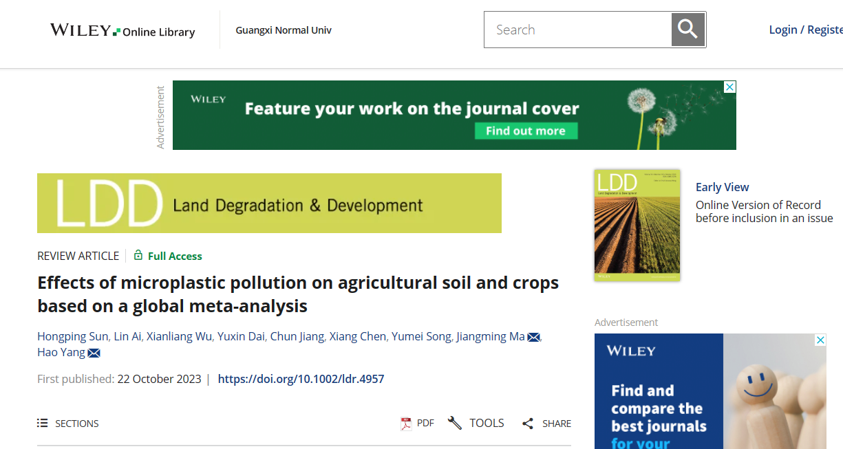 本研究同时得到广西重点研发项目(桂科AB22080071;AB21196065)和桂林市创新平台与人才项目(20220124-9)资助。相关研究结果以题为“Effects of microplastic pollution on agricultural soil and crops based on a global meta-analysis”发表在国际学术期刊《Land Degradation and Development》(JCR Q1区, 中科院二区, IF=4.7)发表。论文第一单位为广西师范大学珍稀濒危动植物生态与环境保护教育部重点实验室,2021级硕士研究生孙红萍为论文第一作者,杨皓博士和马姜明教授为共同通讯作者。