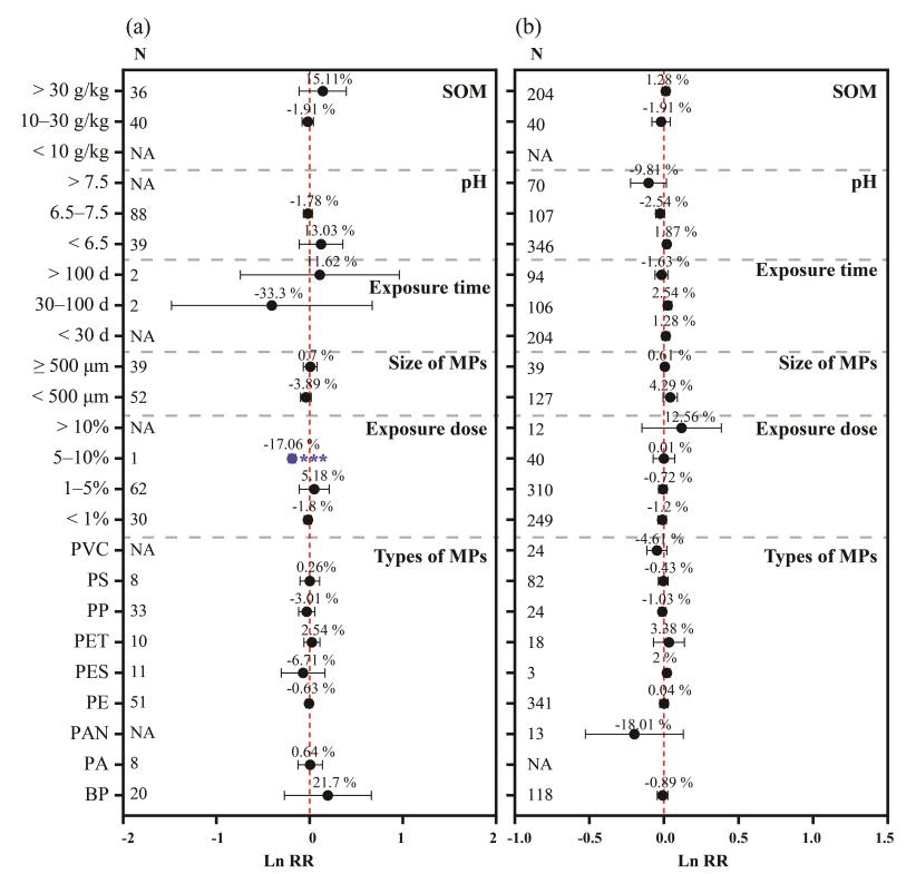 图2土壤物理(a)和化学(b)性质对不同微塑料类型、暴露浓度、大小、暴露时间、土壤pH值和土壤有机质(SOM)含量的响应