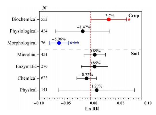 随着人口的增长和工业的发展,塑料制品的使用量逐年增长,导致塑料污染问题越来越严重。然而,目前对于塑料微粒在农业土壤中的残留了解甚少,尤其是对于农作物性状的影响。因此,有必要进行全球范围内的研究,探究不同类型、浓度、大小和暴露时间的塑料微粒以及土壤条件(如土壤pH值或有机物含量)对土壤性质和作物性状的影响。研究通过全球荟萃分析的方法,重点研究了不同塑料材质对土壤性质和作物性状的影响。结果表明:目前,对微塑料的研究主要集中在四个方面:微塑料污染,水环境中的微塑料,农业土壤中的微塑料和微塑料降解。总的来说,相比于土壤性质而言,作物性状对微塑料的响应更敏感,微塑料显著地提高作物生化性状,降低作物形态性状。不同的微塑料类型、浓度、大小、暴露时间、土壤pH和SOM含量对土壤性质和作物性状有不同的影响,土壤酶、作物生化性状和形态性状受微塑料影响显著。作物形态特征中的果实、茎和根;生理性状中的蒸腾作用,呼吸作用和光合作用;以及生化性状中的酶、有机代谢物和无机代谢物均受微塑料的显著影响。同时,微塑料显著降低了土壤中碱性磷酸酶和蔗糖酶的酶活性,增加了土壤中过氧化物酶、酸性磷酸酶、过氧化氢酶和脲酶活性。微塑料促进了作物中过氧化氢酶活性。