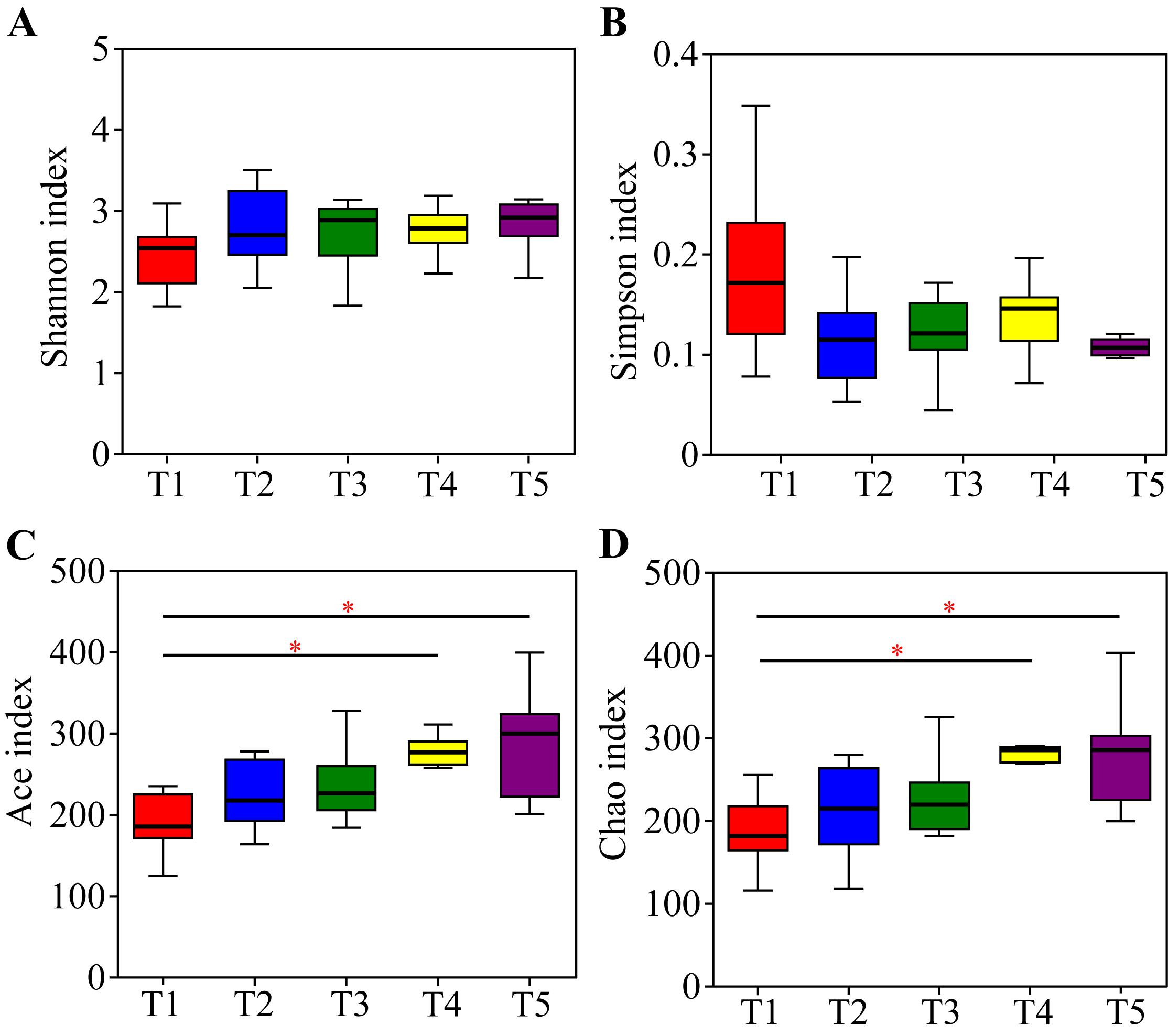图1 不同温度组鳄蜥肠道菌群的Alpha多样性分析