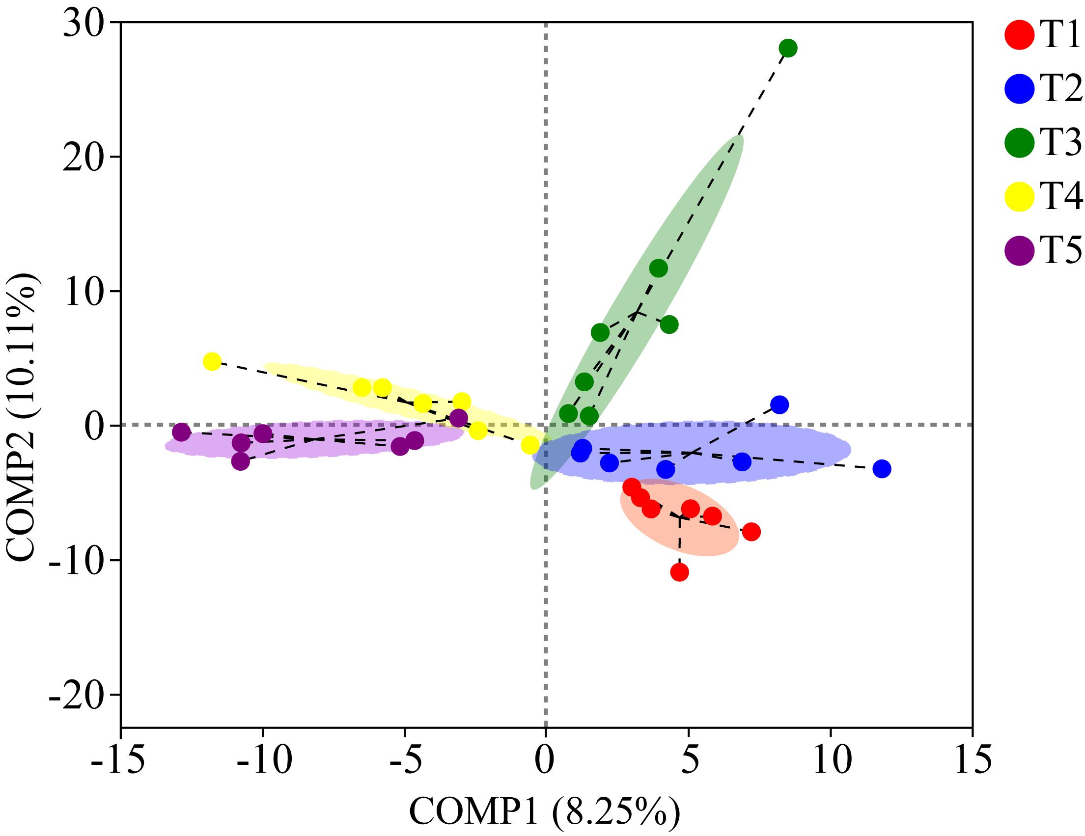 图2 不同温度组鳄蜥肠道菌群的PLS-DA分析