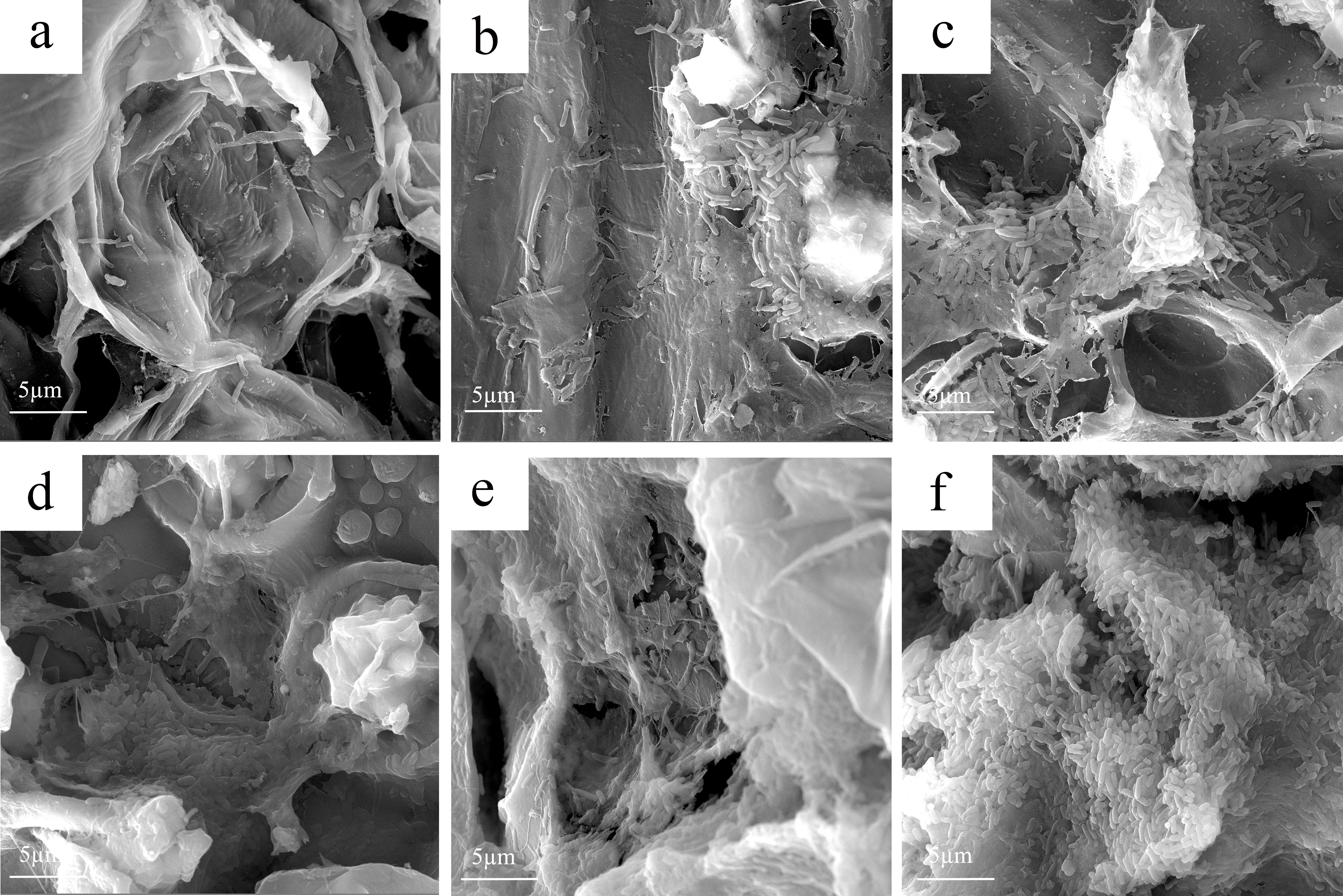 图3.SEM观察棕榈纤维制备的阳极表面生物膜形貌.