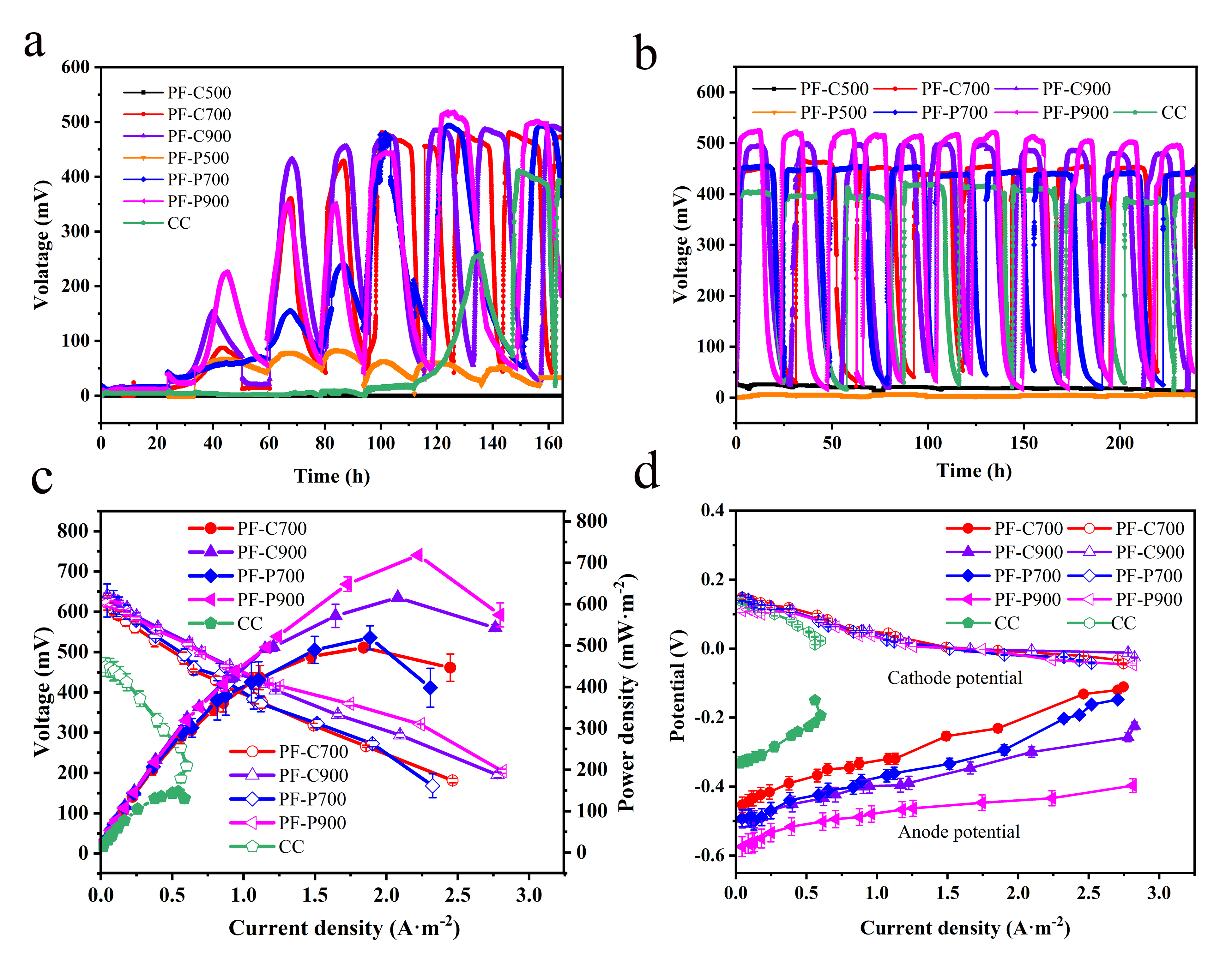 图1.以棕榈纤维制备的阳极材料产电性能.