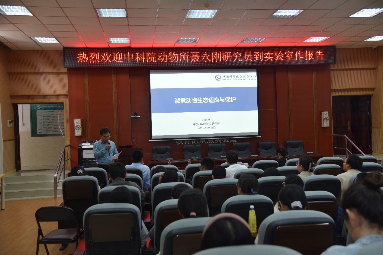 2023年12月11日,中国科学院动物研究所聂永刚研究员应邀到我院珍稀濒危动植物生态与环境保护教育部重点实验室作学术报告,报告题为“濒危动物生态适应与保护”。我院院长武正军主持报告会,学院70余名师生参会。