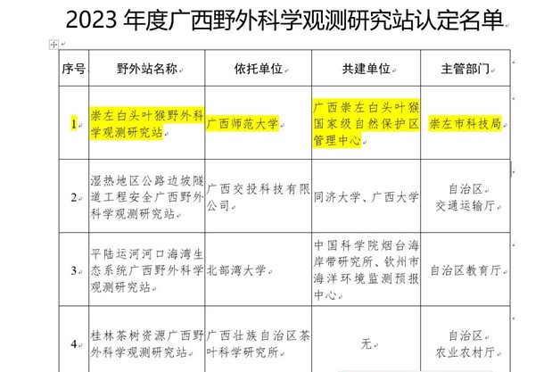 近日,自治区科技厅公布2023年度广西野外科学观测研究站认定结果,我院崇左白头叶猴野外科学观测研究站获批建设,这是我院获批的第3个自治区级科技创新平台。