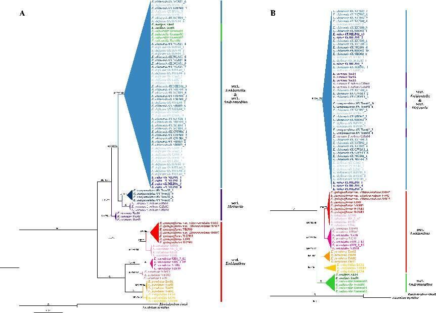 图4 包含二倍体和多倍体的吊钟花属nrITS树(A)和OG9899树(B)
