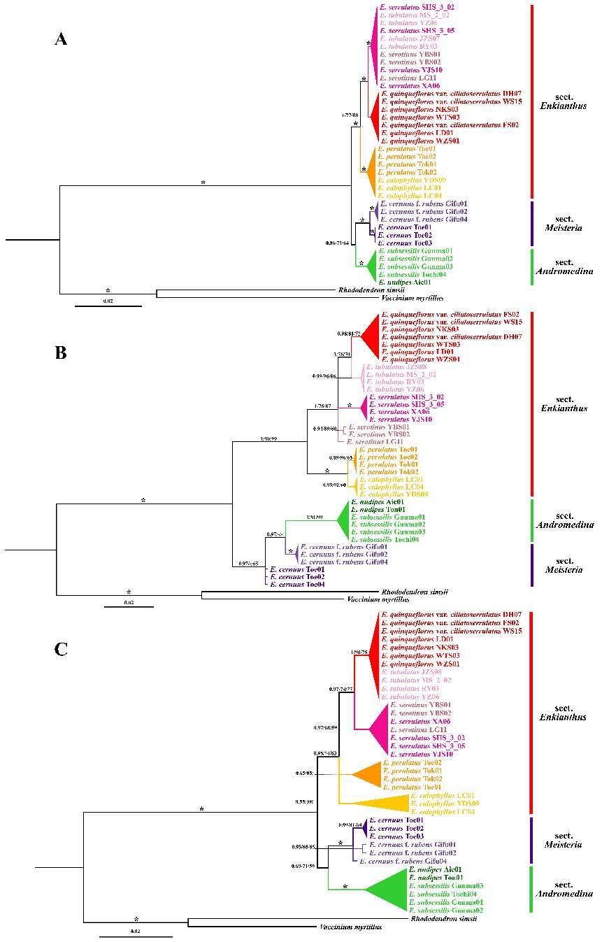 图2 基于6个叶绿体基因片段(A)、nrITS(B)和一个单拷贝核基因(OG9899)(C)构建的吊钟花属二倍体物种系统发育树