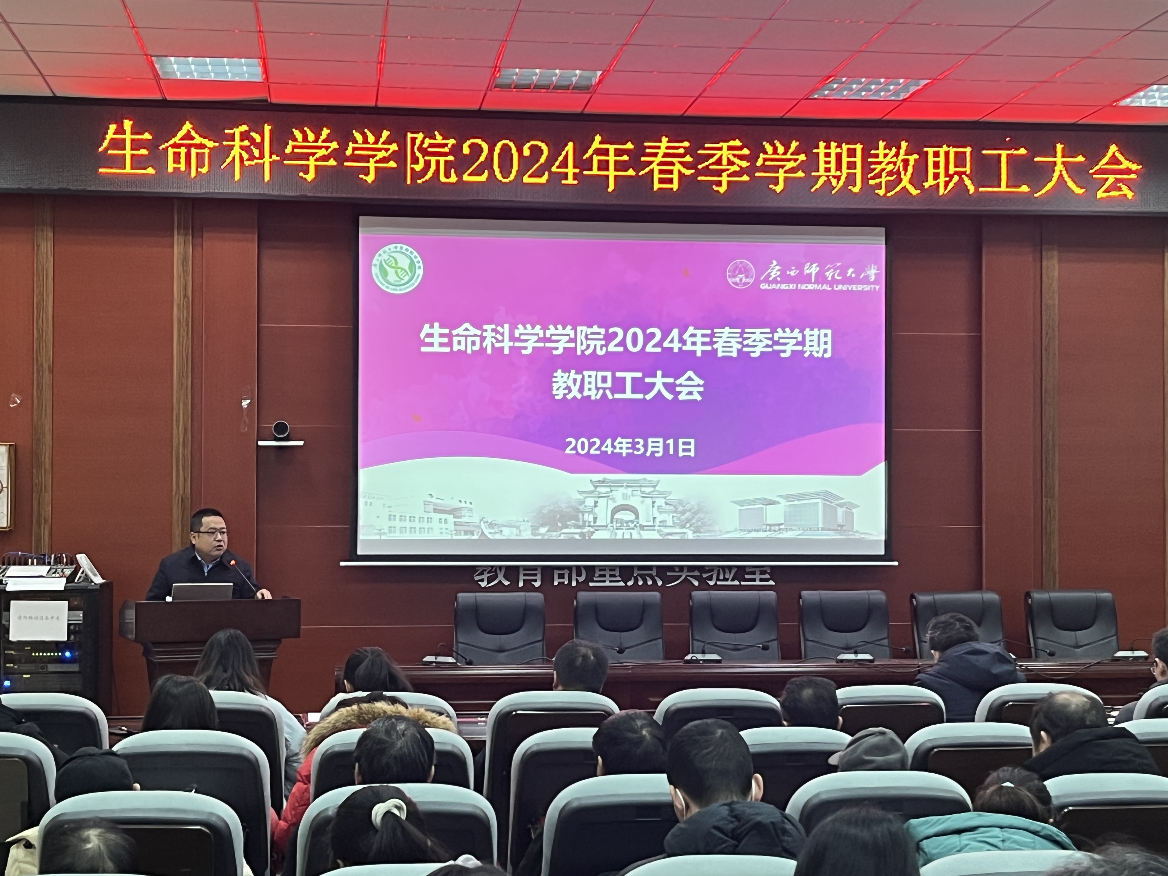3月1日下午,生命科学学院在雁山校区教育部国家重点实验室会议室召开2024年春季学期教职工大会,深入学习贯彻习近平总书记关于教育的重要论述精神和对广西重大方略要求,传达学习2024年学校工作布置会精神,部署新一年学院重点工作,以龙马精神、龙骧凤矫的奋斗姿态推进学院实现创新发展、特色发展、高质量发展,为学校国内一流大学建设这一大局贡献生科力量和智慧。学院全体教师参加会议,会议由学院党委主要负责同志主持。