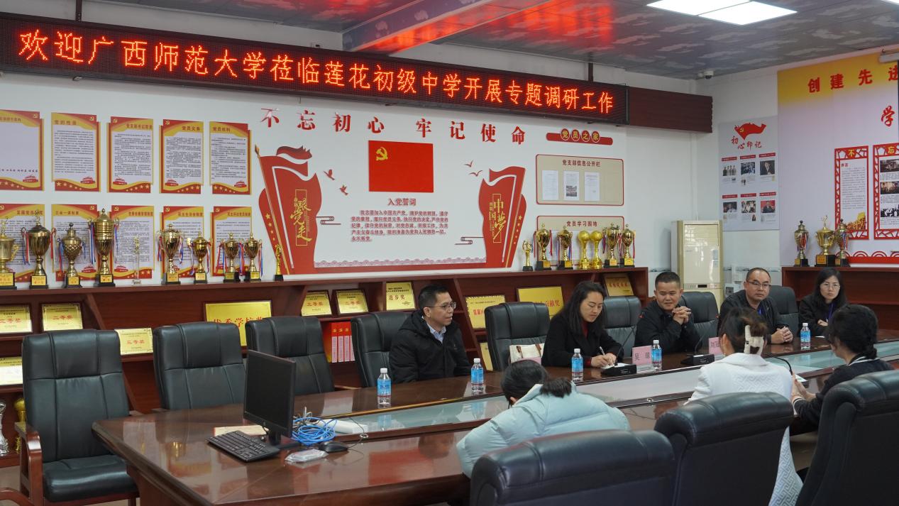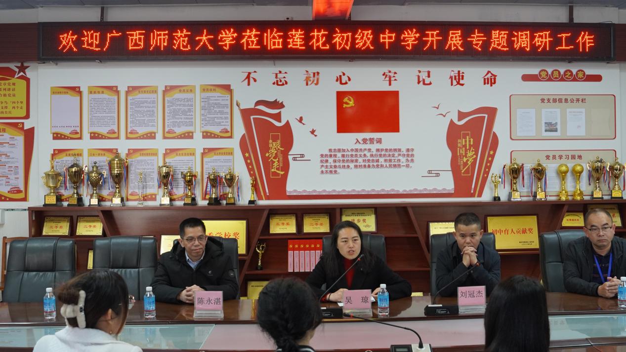 为深入贯彻落实立德树人根本任务,进一步提升人才培养质量,2024年3月12日上午,生命科学学院副院长吴琼赴莲花镇初级中学召开人才培养方案修订暨广西师范大学毕业教师座谈会,与鼎湖区教育局相关负责人、莲花镇初级中学校长、毕业教师代表座谈交流。