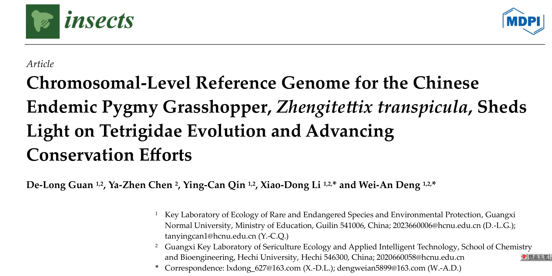 (1)在昆虫学权威期刊《Insects》(中科院 2区且Top)发表题为“Chromosomal-Level Reference Genome for the Chinese Endemic Pygmy Grasshopper, Zhengitettix transpicula, Sheds Light on Tetrigidae Evolution and Advancing Conservation Efforts”的研究论文。蚱科(Tetrigidae)是直翅目中一个独特的类群,以小型体型、弱飞行能力和以苔藓为主食而闻名。蚱科昆虫通常具有极其有限的分布范围和脆弱的种群结构,部分物种甚至面临灭绝风险。这种生物学特性与能远距离迁飞、体型庞大、危害广泛的飞蝗与沙漠蝗等其他知名直翅目害虫形成鲜明对比。因此,研究蚱科为何缺乏种群爆发能力,以及如何适应独特的森林淡水生态环境,对于理解蚱科的生态适应性演化,以及直翅目的分化演化具有重要意义。然而,由于缺乏基因组资源,相关研究一直受阻。