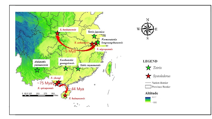 利用目前可获得的全部蚱科昆虫线粒体基因组,我们提取蛋白质编码基因构建系统发育树,并基于分子分化时钟结合化石校正节点,推断了蚱科的演化历史。结果揭示了蚱科的分子演化模式,并就蚱属与尖顶蚱属分类提出新见解。与蚱科化石证据印证相互佐证,我们推断蚱科约于1.5亿年前开始独立演化,是直翅目较早分化的类群之一。蚱属之前被过度拆分,现存的日本蚱与台蚱属、突顶蚱属的线粒体序列高度相似,并具有一个独特的潜在tRNA-Ile编码结构域,加之分化时间极短,因此本研究认为这些属应并入一个属别,该观点也更符合日本蚱广布种的生态状况。之前对蚱属快速适应性辐射的认识可能不足,导致了对该属的过度拆分。而对于尖顶蚱属(Systolederus),情况则截然不同,该分类单元可能存在过度合并。之前一直将尖顶蚱与狭顶蚱合并为一属的做法或许过于简单,与先前研究者的观点一致,尖顶蚱属目前是将南北方类群暂时合并的结果,未来获得更多证据后应予分开。我们的结果支持这一观点,虽然暂时无法寻得更合适的形态分类依据,但分子数据已经清楚显示,尖顶蚱属南方物种自约7500万年前起,便分化并分布范围限制在广西等地,而北方物种仅用不到500万年,便广泛扩散并在长江流域一带分化。