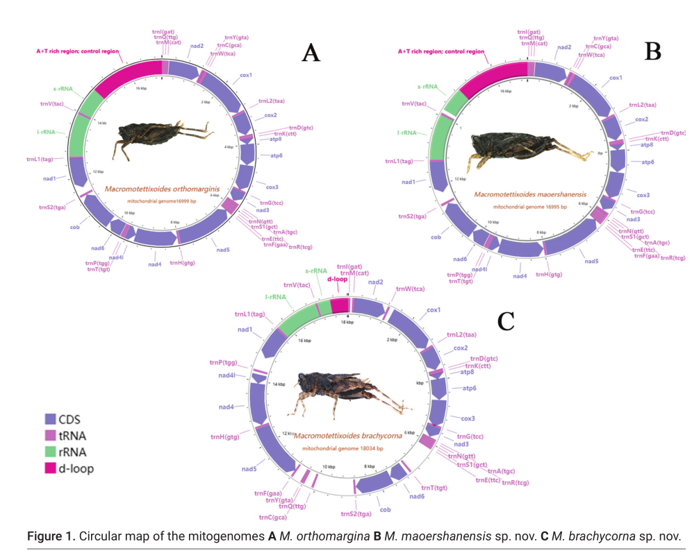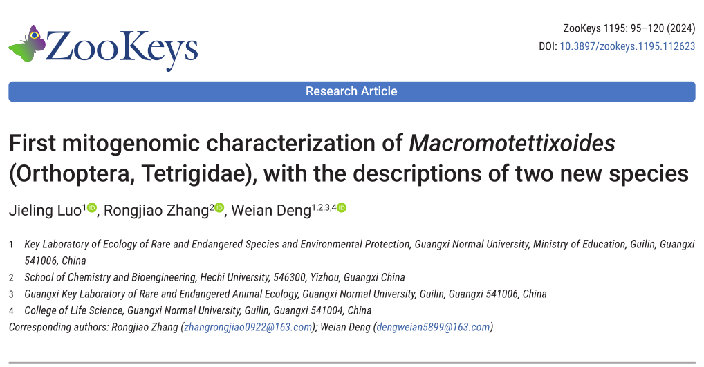 (4)在动物分类权威期刊《Zookeys》(中科院3区)发表题为“First mitogenomic characterization of Macromotettixoides (Orthoptera, Tetrigidae), with the descriptions of two new species”的研究论文,从形态上短翼蚱亚科的拟大磨蚱属Macromotettixoides 和蚱亚科的台蚱属Formosatettix 很相似,一些种类鉴定和分类较为困难。论文获得两种蚱类的新物种,首次通过分子鉴定手段解决其分类问题,通过测序获得全线粒体基因组数据,构建蚱科分子系统发育关系,确定了两新种的分类地位,并修订了拟大磨蚱属的亚科分类地位。