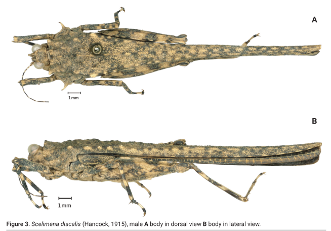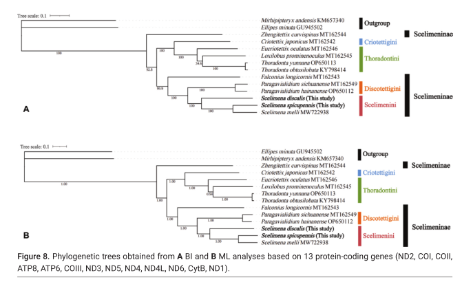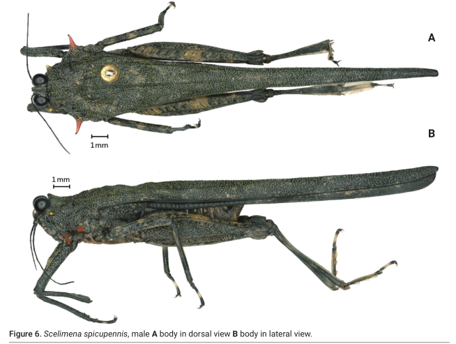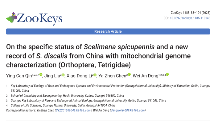 (5)在动物分类权威期刊《Zookeys》(中科院3区)发表题为“On the specific status of Scelimena spicupennis and a new record of S. discalis from China with mitochondrial genome characterization (Orthoptera, Tetrigidae)”的研究论文,通过基因测序获得Scelimena spicupennis和Scelimena discalis两种刺翼蚱属Scelimena 的全线粒体基因组(大小分别是17,552 bp 和 16,069 bp)并深入讨论了它们的基因组特征。和原先自己测有的10种刺翼蚱亚科的种类一起,利用13个蛋白编码基因构建刺翼蚱亚科分子系统发育关系:(Zhengitettix + ((Falconius +(Paragavialidium + Scelimena)) + (Criotettix + (Eucriotettix + (Loxilobus + Thoradonta))))),并深入讨论它们的单系性。另外,分别对Scelimena spicupennis和Scelimena discalis(中国新记录)两种刺翼蚱进行了修订研究。