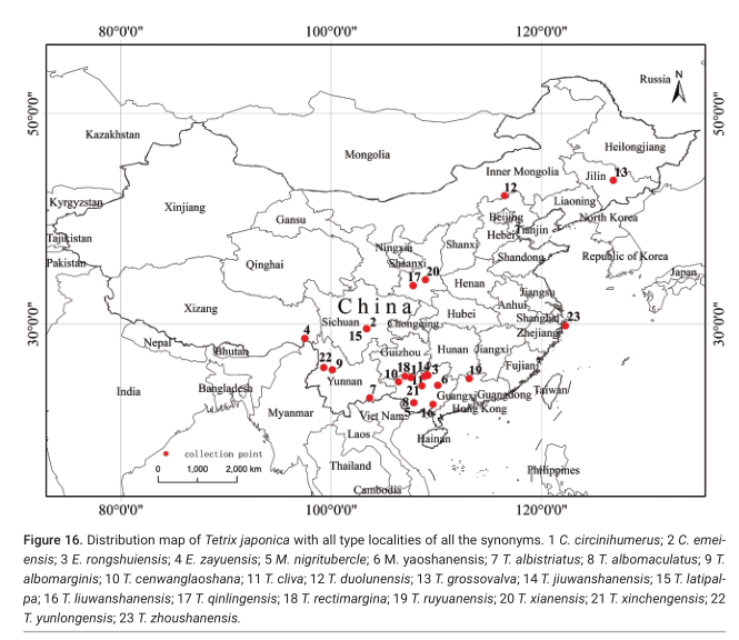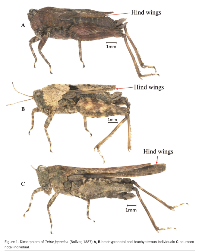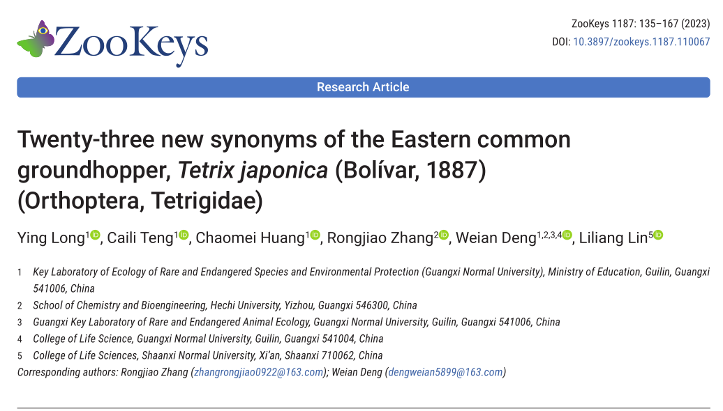 (3)在动物分类权威期刊《Zookeys》(中科院 3区)发表题为“Twenty-three new synonyms of the Eastern common groundhopper, Tetrix japonica (Bolívar, 1887) (Orthoptera, Tetrigidae)”的研究论文。邓维安教授经过20多年的野外观察和室内养殖,发现日本蚱Tetrix japonica 型变相当复杂,多态性极为显著,于是提出了不少的蚱类可能是日本蚱的同物异名体的观点。为了证实这一点猜想,前几年邓维安教授带领团队成员先后到了中国科学院动物研究所、陕西师范大学、中山大学、南京师范大学、华中农业大学、河北大学、淮北师范大学等国内保存蚱类模式标本的博物馆,系统检验了蚱类的模式标本,发现有23种日本蚱的同物异名体。基于这一基础上,本论文首次对东亚的广布种日本蚱Tetrix japonica进行了系统修订,提出了型变的主要原因,这一研究成果确定日本蚱可以做为蚱类昆虫行为学、生态学和基因组学等领域研究的模式昆虫。研究成果得到国际同行(Josip Skejo,Zhu-Qing He)等高度的称赞和认可,认为该成果将把直翅目昆虫分类推进到了一个分类修订的时代。