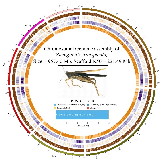 Figure 1. Circos representation of the Z. transpicula genome. The layers of the de-piction from inside to outside represent the density of GC content, frequency of repeat elements, distribution of variant sites, and gene expressions. The color gradient from light to dark represents the density of different layers, ranging from low to high. Nested within the Circos diagram, a dorsal view of Z. transpicula is presented as a species identification. The figure also includes a metric panel illustrating the Benchmarking Universal Single-Copy Orthologs (BUSCO) assessment, which was utilized to estimate the completeness of the chromosomal genome assembly.