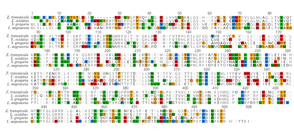 Protein sequence alignment of CYP305m2 homologs from Z. transpicula, E. oculatus, L. migratoria, and S. gregaria. All disagreements to consensus bases are highlighted using MacClade software's color style.