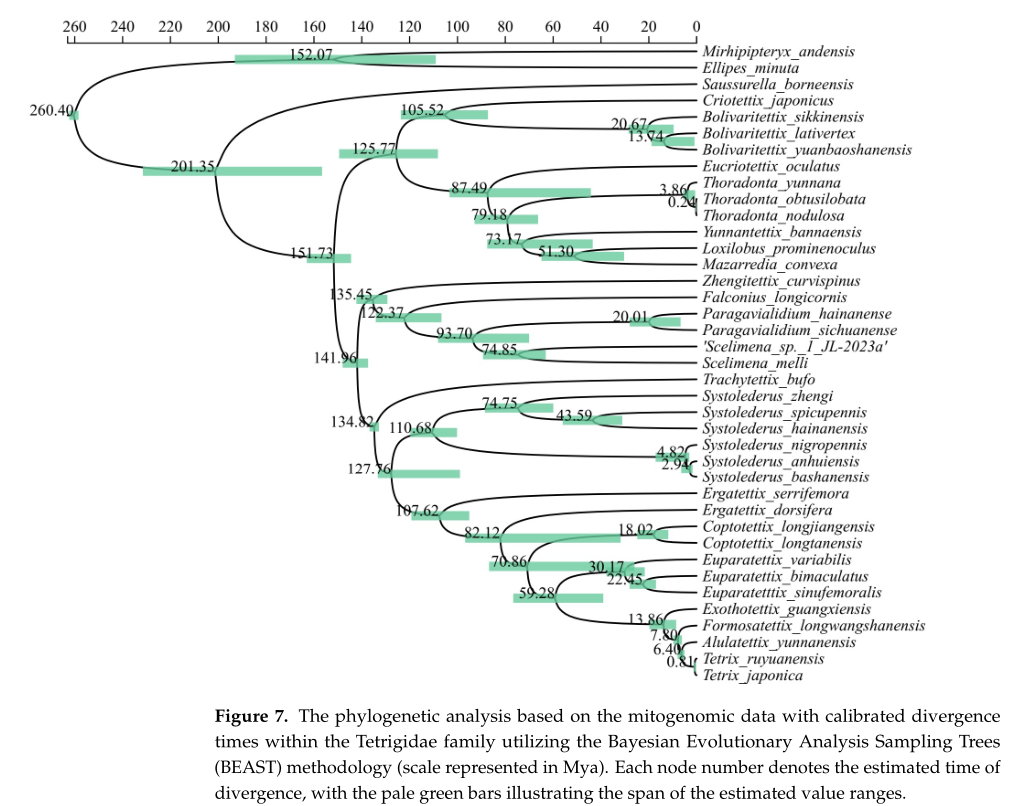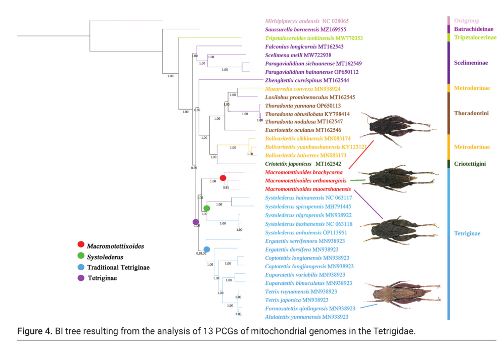 (2)在昆虫学权威期刊《Insects》(中科院2区且Top)发表题为“Reassessment of the Phylogenetics of Two Pygmy Grasshopper Generic Groups Tetrix and Systolederus through Mitochondrial Phylogenomics Using Four New Mitochondrial Genome Assemblies”的研究论文。蚱科Tetrigidae物种多样性丰富,目前已知近2000种,分类系统复杂,存在大量有待订正之处。近期有研究提出:尖顶蚱属与狭顶蚱属应予合并,而台蚱属则可并入日本蚱属。为厘清此观点,本研究构建了四种新的蚱科昆虫的完整线粒体基因组,以期对这两个属的分类关系进行分子订正。