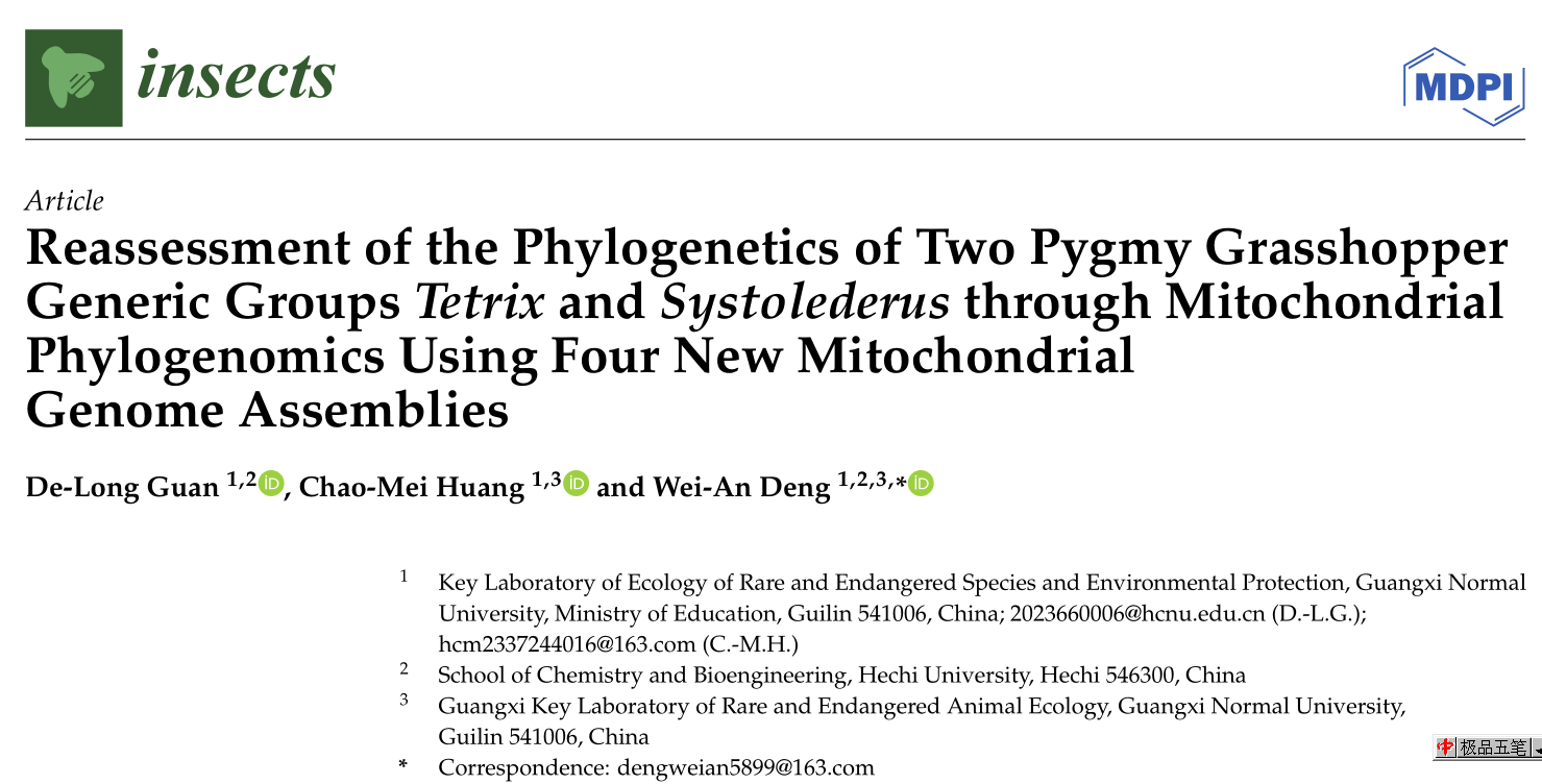 近期,我院邓维安教授团队在蚱类昆虫系统学领域取得系列研究进展,先后在《Insects》(中科院2区,Top期刊,2篇),《Zookeys》(中科院3区,3篇),《Zootaxa》(中科院4区)发表6篇学术论文。