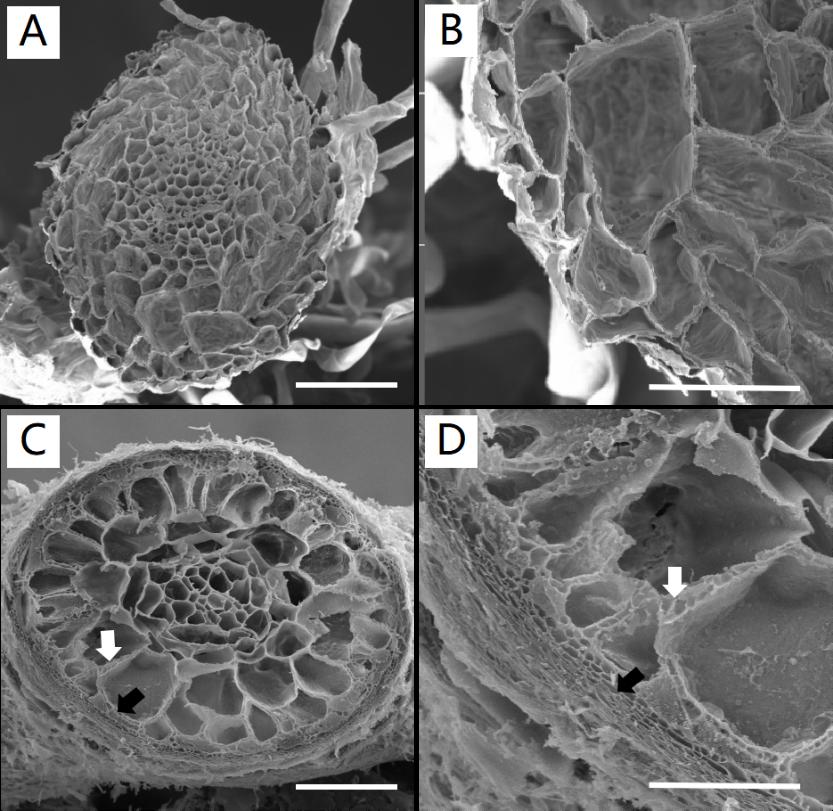 图4. 非菌根马尾松与菌根化马尾松根部横切面形态差异(A、B, 非菌根马尾松的根; C-D, 菌根化马尾松的根).