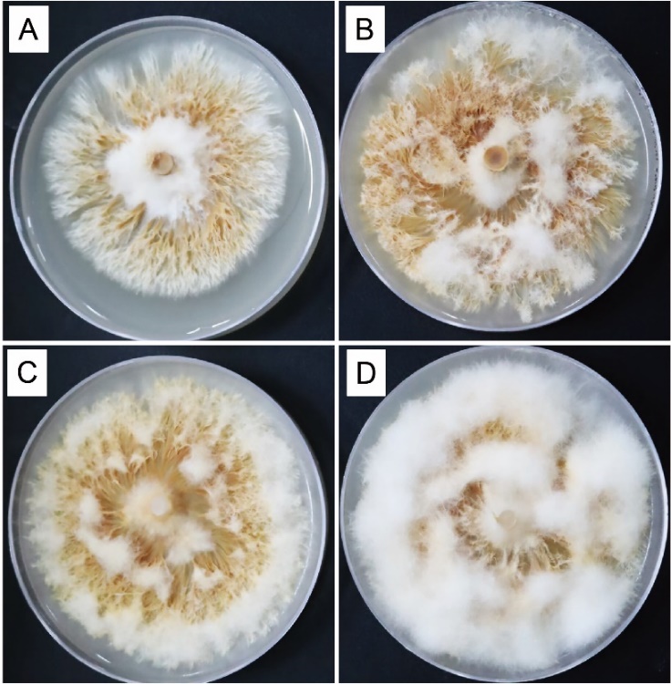 图2. 不同pH值PDA培养基培养的红汁乳菇L. hatsudake GX01菌落形态差异(A, pH 4.0; B, pH 5.0; C, pH 6.0; D, pH 7.0).