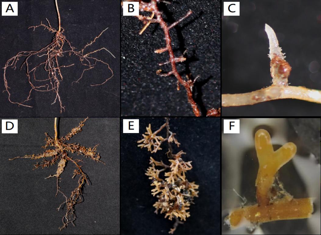 图3. 非菌根马尾松与菌根化马尾松根部形态差异(A-C, 非菌根马尾松的根; D-F, 菌根化马尾松的根).
