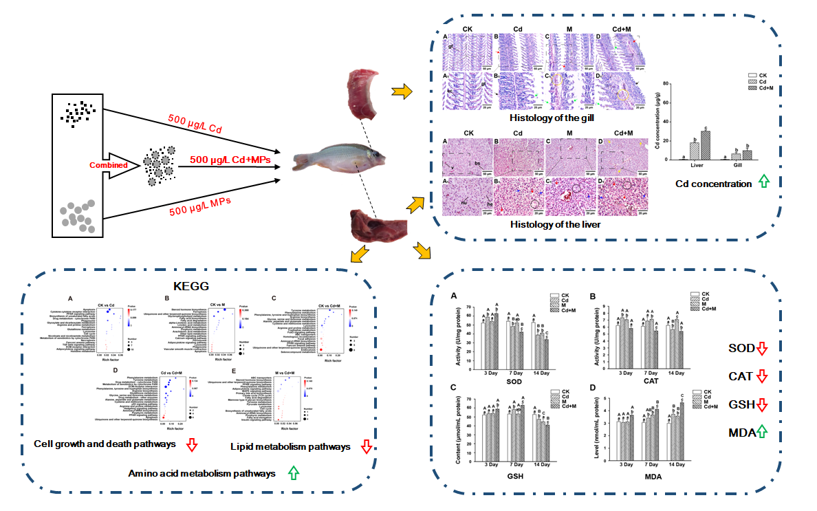 研究表明(图1): MPs促进Cd在禾花鲤中的累积,复合胁迫组肝脏、鳃组织中的Cd浓度显著高于单独胁迫,具有协同效应。Cd和Cd + MPs处理影响肝脏组织的结构完整,引起肝细胞坏死等病理损伤;此外,复合暴露还导致了肝血窦扩张。MPs和Cd + MPs处理导致鳃组织细胞增生、鳃片扭曲以及充血和肿胀。MPs和Cd单一及复合胁迫均干扰禾花鲤肝脏抗氧化系统的正常运行,可能会引起氧化应激的发生。Cd暴露组中的大部分差异表达基因(DEGs)富集在 “免疫”和“细胞生长与死亡”相关通路, Cd暴露影响了禾花鲤的免疫防御功能。脂质代谢相关的DEGs在MPs组中显著下调,表明MPs影响肝脏脂类代谢。复合暴露组中与“免疫功能”和“氨基酸代谢”相关的DEGs上调,即复合胁迫影响禾花鲤的免疫功能及氨基酸代谢,不利于禾花鲤的健康。