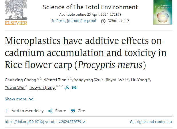 2024年4月25日,相关研究结果题为“Microplastics have additive effects on cadmium accumulation and toxicity in Rice flower carp (Procypris merus)”在国际学术期刊《Science of The Total Environment》(中科院一区 TOP, IF = 9.8, JCR Q1区)发表。论文第一单位为广西师范大学珍稀濒危动植物生态与环境保护教育部重点实验室,2021级硕士研究生程春醒为第一作者,2021级硕士研究生吴扬扬、2023级硕士研究生韦金友等为参与作者,蒋骄云副教授为通讯作者。