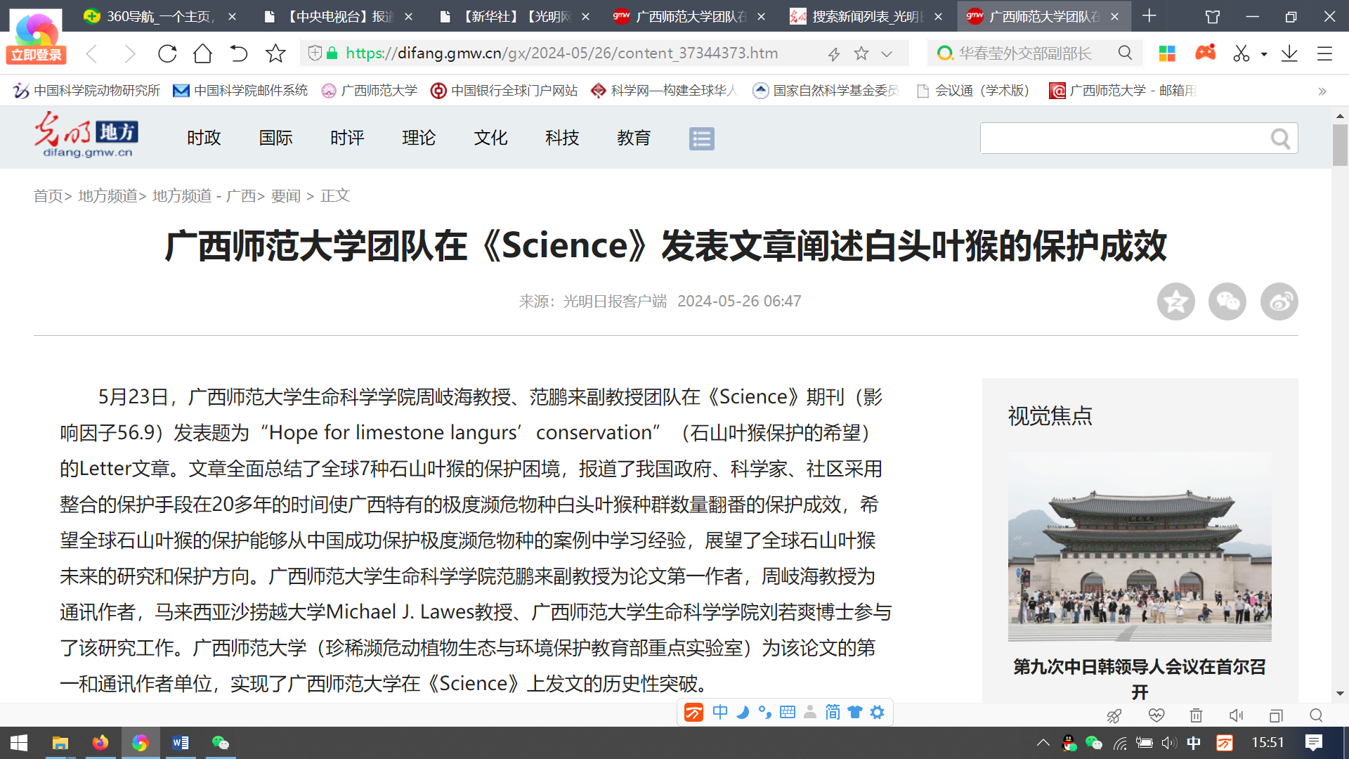 5月26日,光明日报客户端以《广西师范大学团队在Science发表文章阐述白头叶猴的保护成效》为题,关注报道了我校生命科学学院周岐海教授/范鹏来副教授团队对白头叶猴研究与保护成果。
